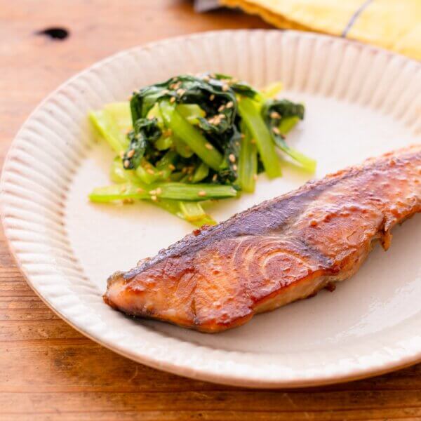皿に小松菜を盛り、焼き上がったぶりをのせる。