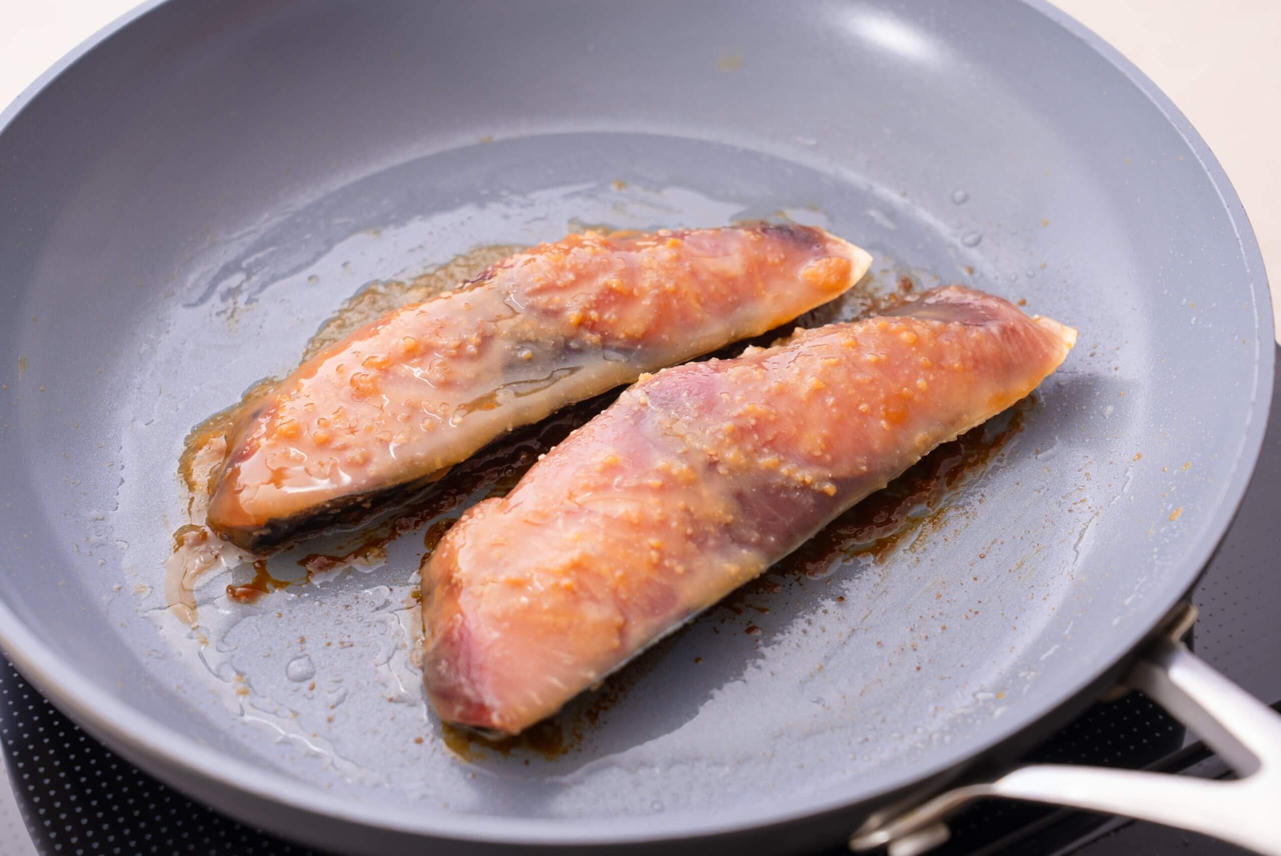 ぶりの表面の味噌を軽くぬぐい、フライパンまたは魚焼きグリルで両面こんがり焼く。※焦げやすいので中火〜弱めの中火で。