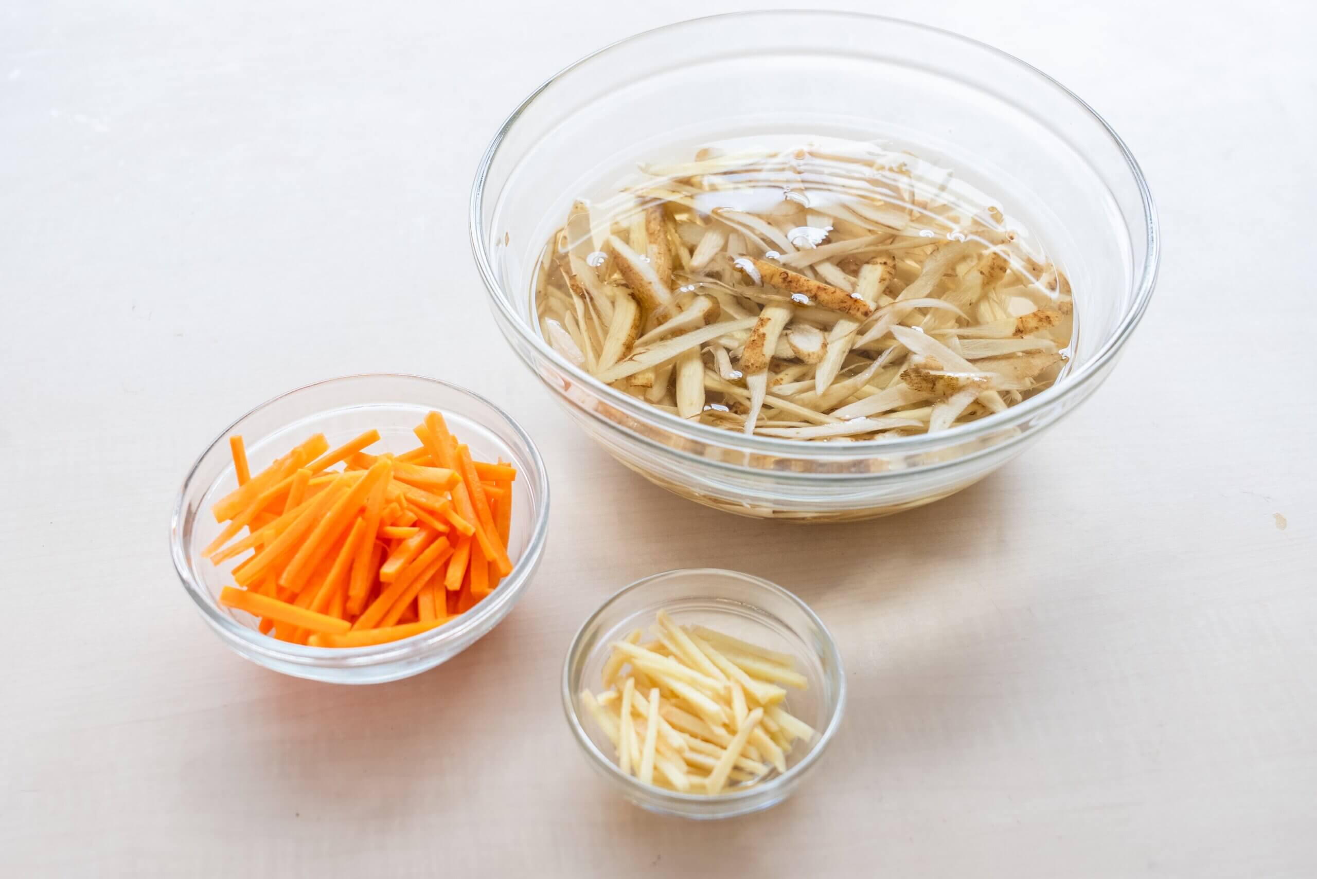 ごぼうは皮をこそげ、ささがきにして水にさらす。にんじんは細切り、しょうがは千切りにする。米は洗って通常通り炊く。