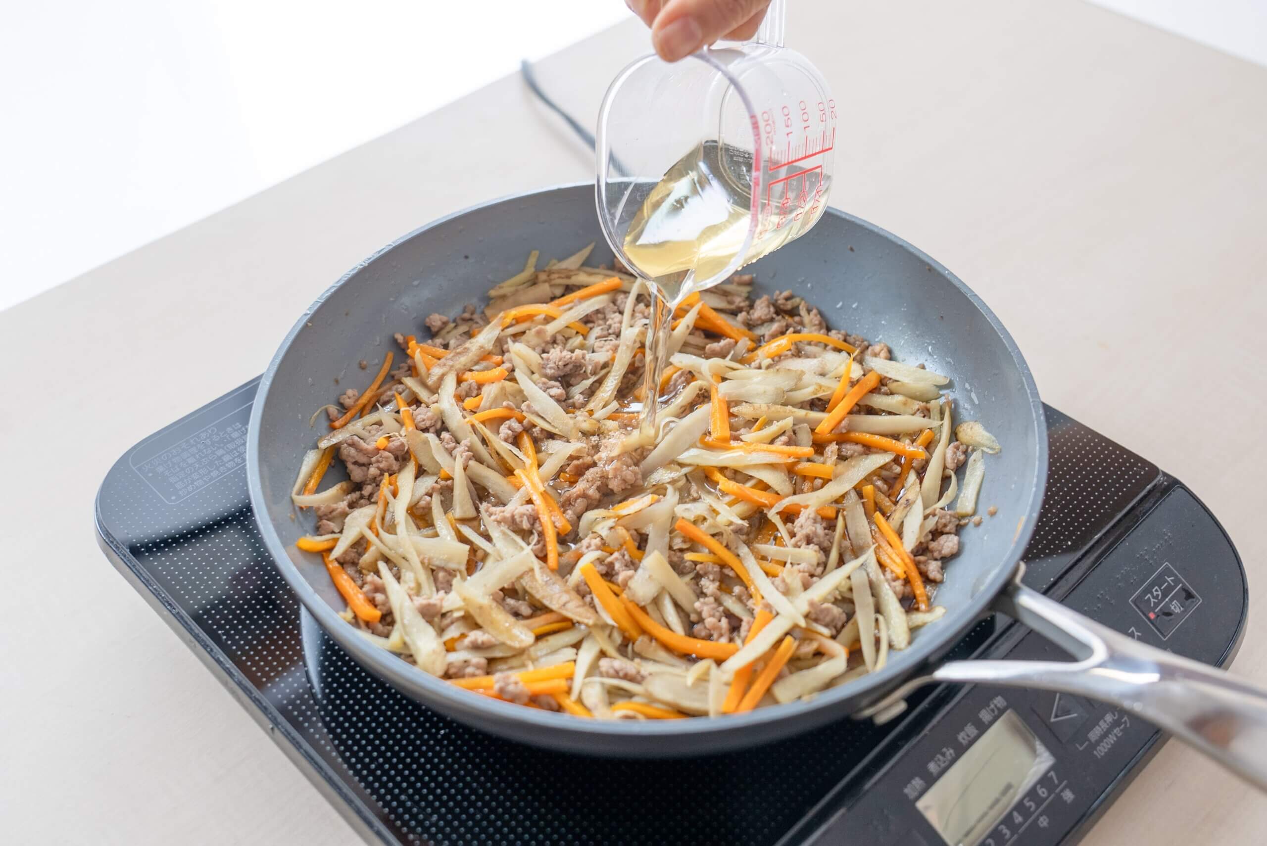 ごぼう・にんじんを加えて炒め合わせ、油が回ったら【A】を加える。ひと煮立ちしたら落とし蓋をして、弱めの中火で10分煮る。火を止め、粗熱が取れるまで置いて味を含ませる。