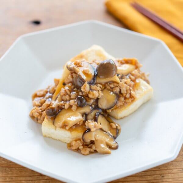 今日のレシピは・・・「豆腐ステーキのそぼろきのこあんかけ」