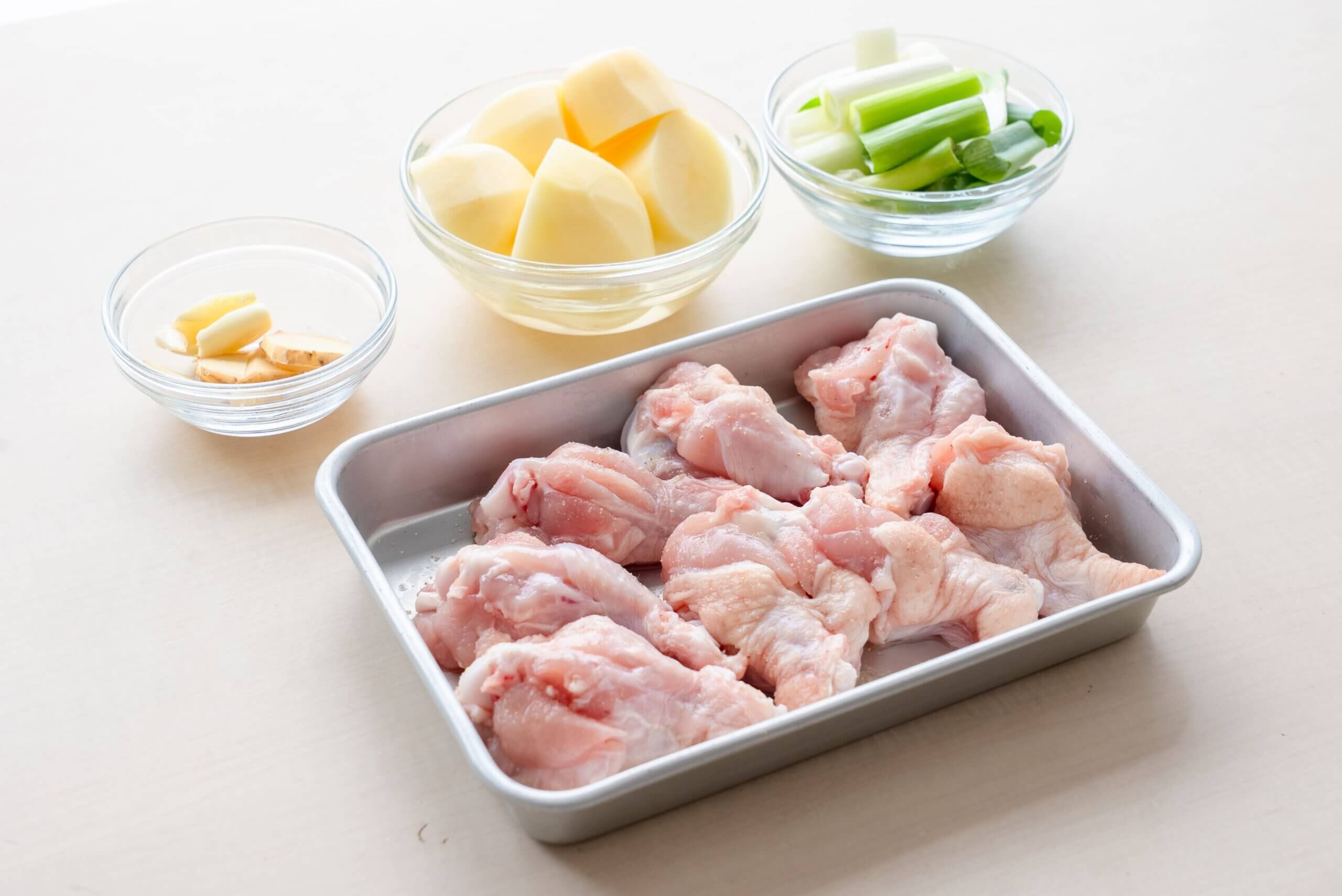長ネギは4〜5cm幅に切る。じゃがいもは皮をむいて半分〜4等分に切る。にんにくはつぶし、しょうがはスライスする。鶏手羽元は骨の横に切り込みを入れ、塩・こしょう(各少々・分量外)をふる。