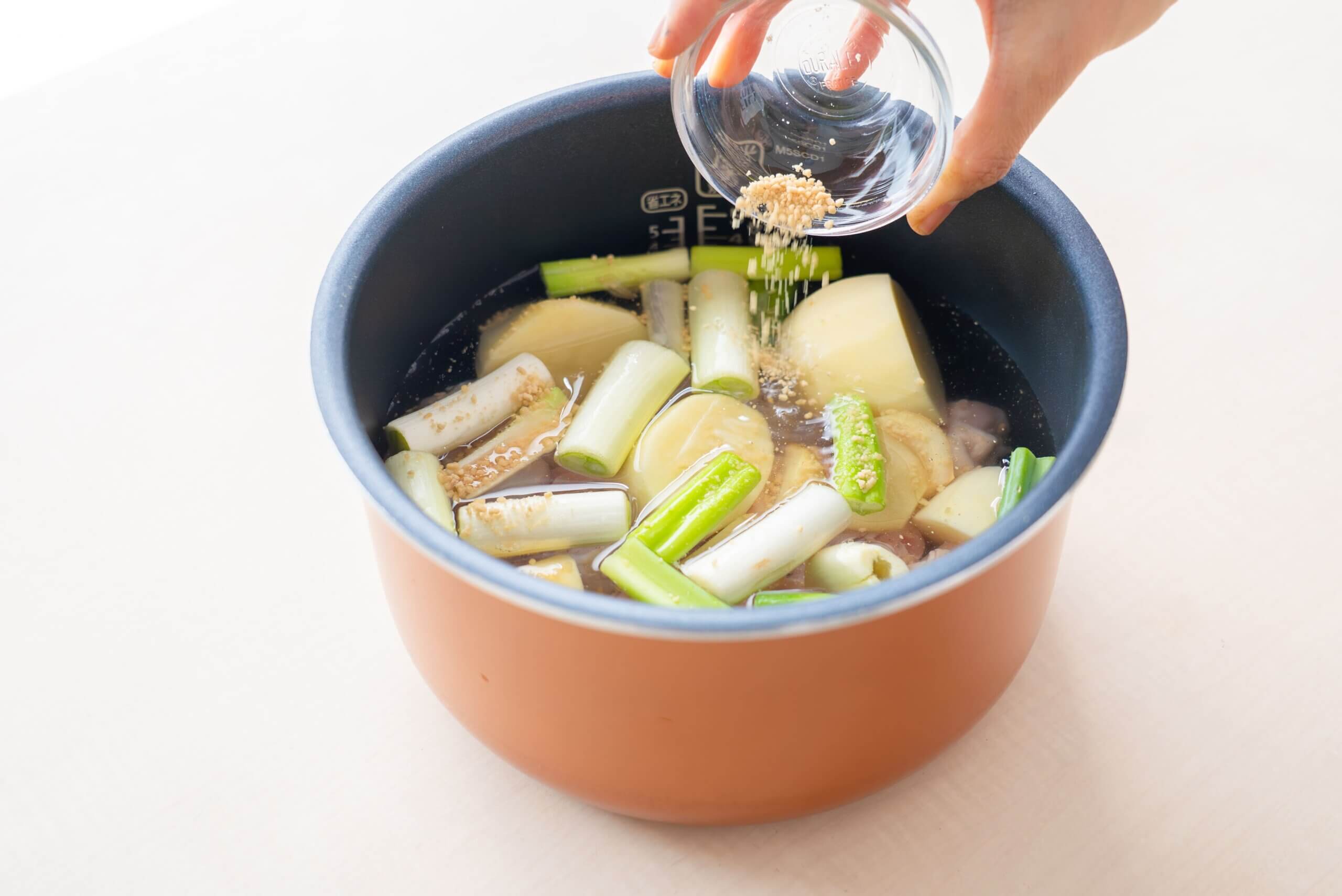 内釜に鶏手羽元・じゃがいも・長ねぎ・トッポギ・にんにく・しょうがを入れる。酒・水・鶏ガラスープの素・塩を加えて軽く混ぜ、通常炊飯モードで炊く。
