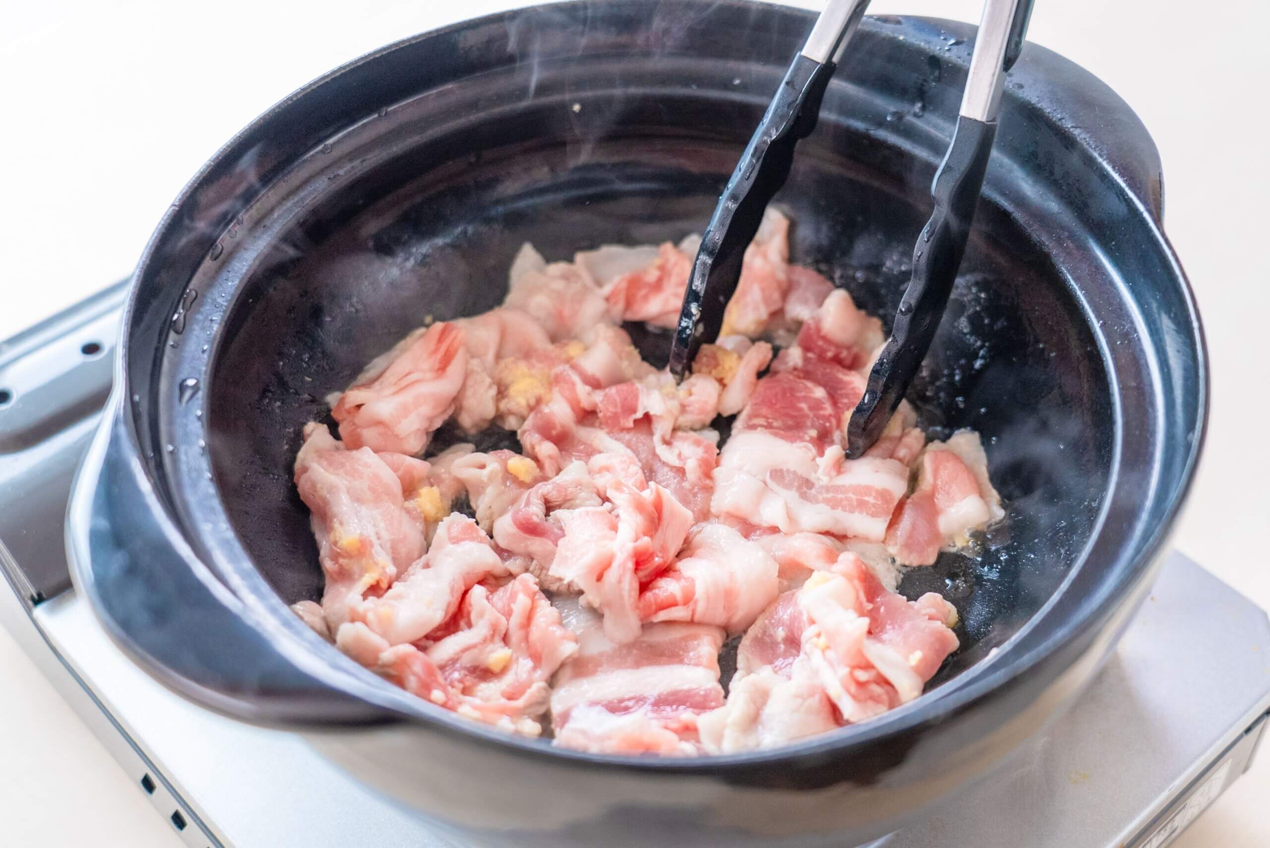 鍋にごま油を熱し、豚肉を中火で炒める。