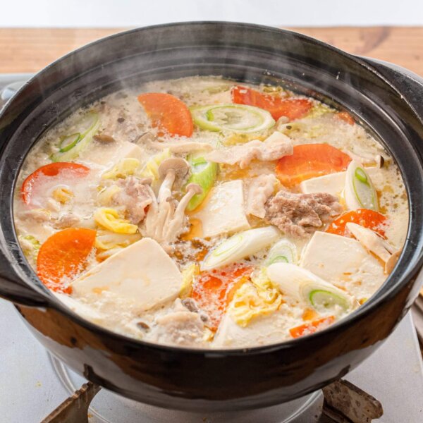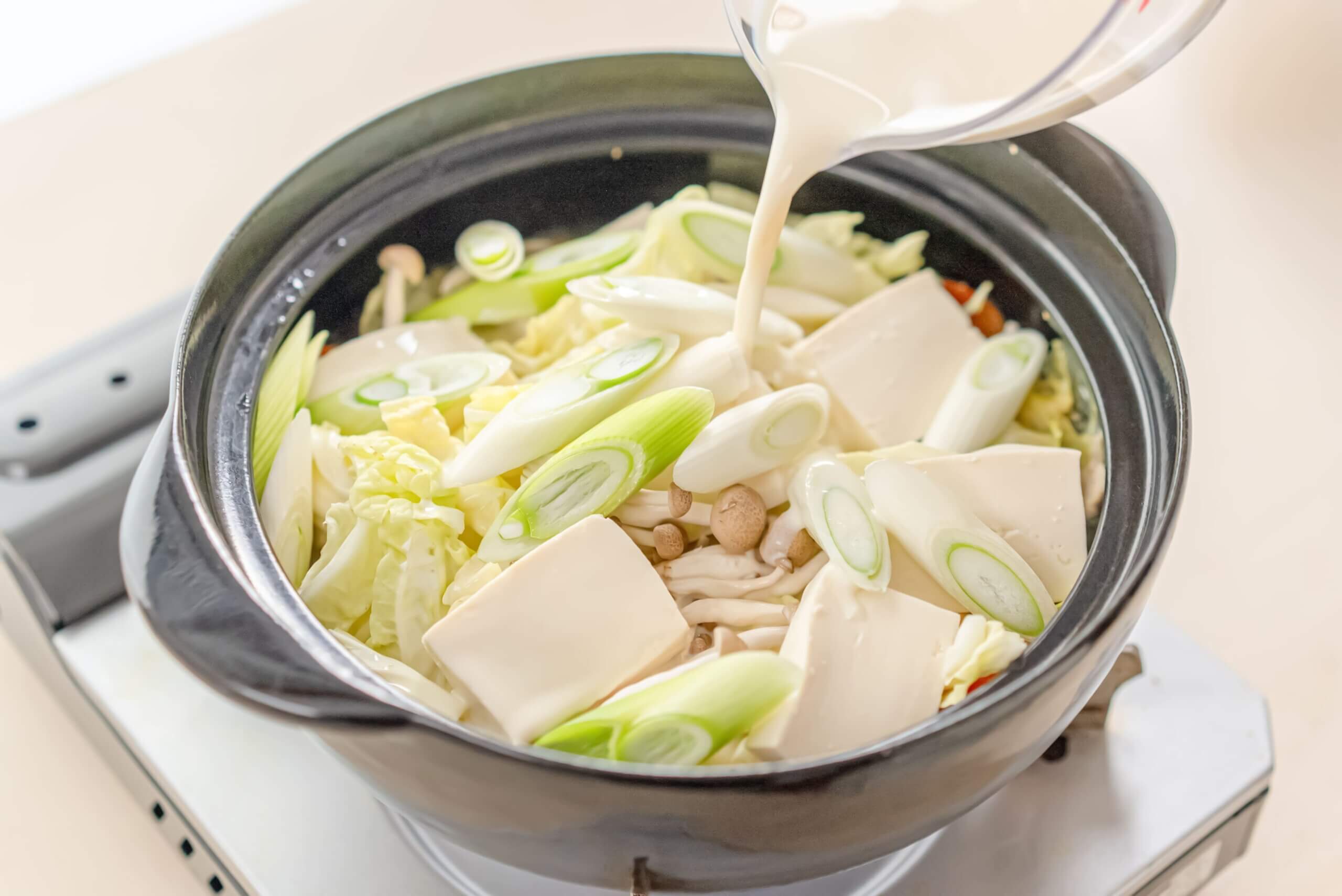 火を弱めて味噌を溶き入れ、豆腐・白菜の葉・長ねぎを加える。豆乳を加えて温め、全体がなじんだら完成。