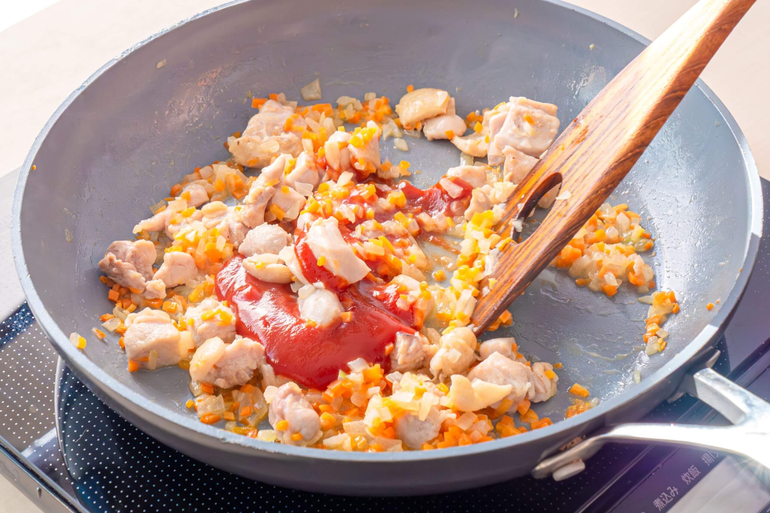 炒めた鶏もも肉と野菜をケチャップで味付けしたチキンライスに、