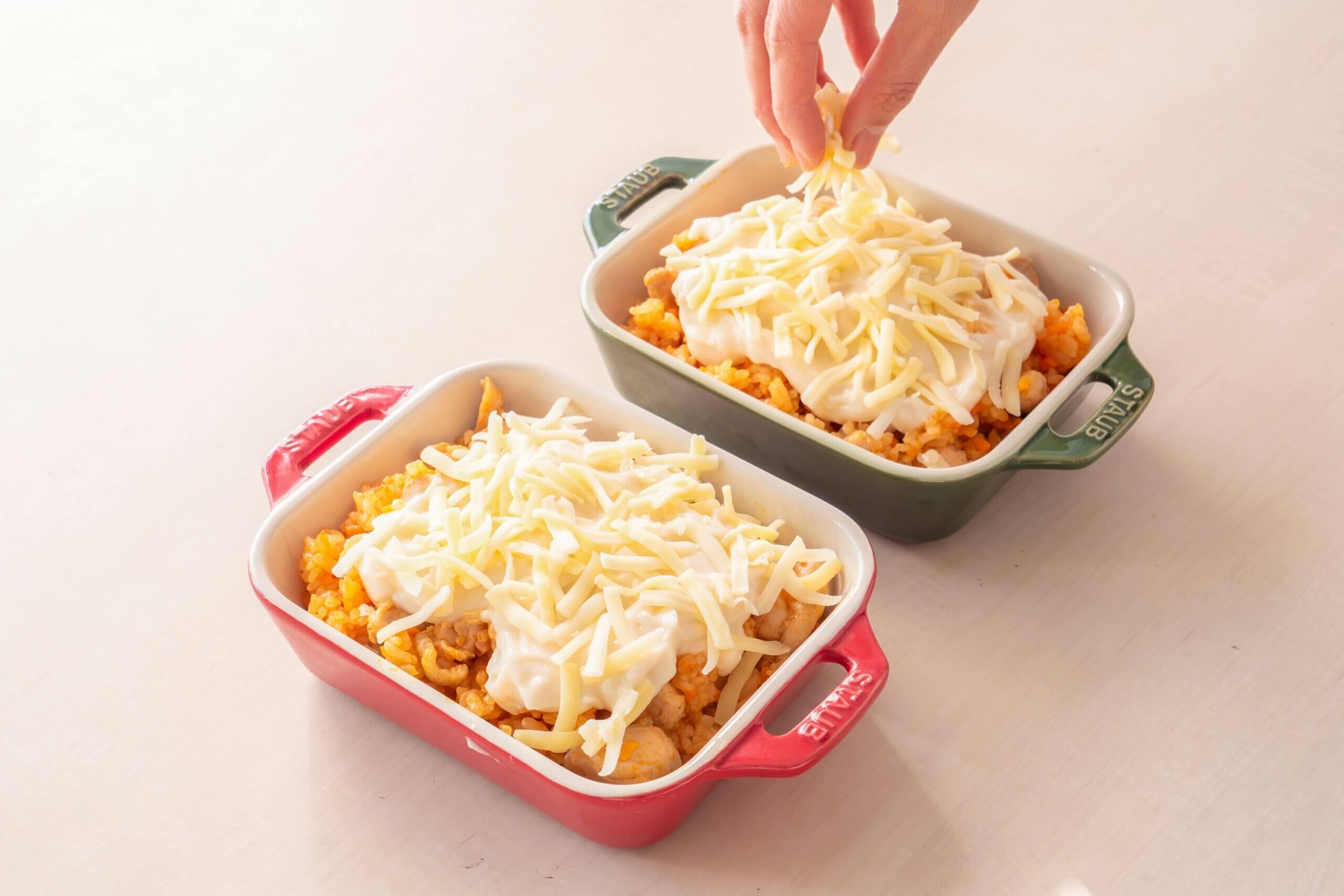 耐熱皿にチキンライスを広げ、ホワイトソースとチーズをのせる。トースター(220℃)でチーズがこんがりするまで焼く。