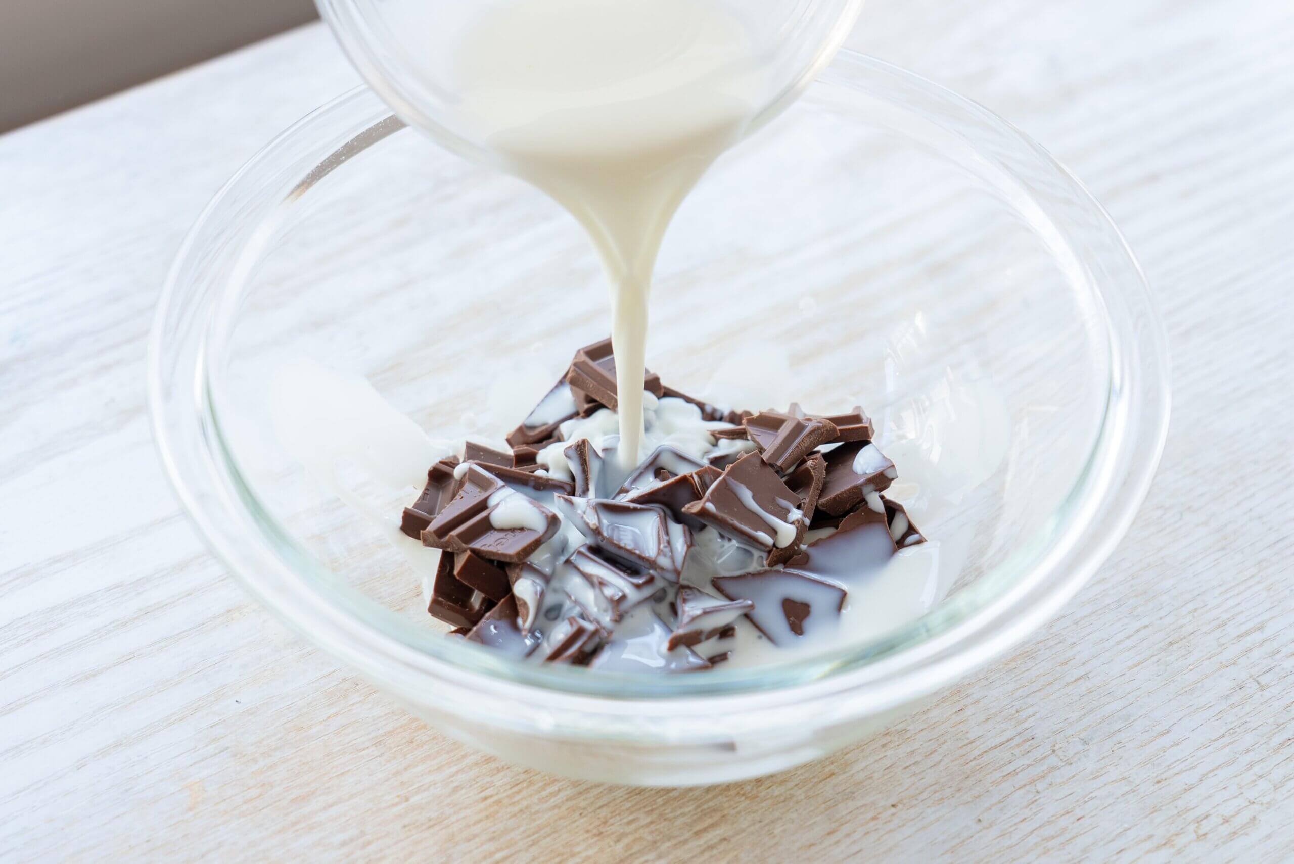 耐熱ボウルにチョコレートと牛乳を入れ、ラップをせずに電子レンジ(600W)で1分半加熱する。泡立て器でよく混ぜ合わせる。フランスパンをくぐらせる。しみ込みづらいパンの場合は、ボウルやジッパーつき袋で漬け込んでおくと中までしみ込みます。