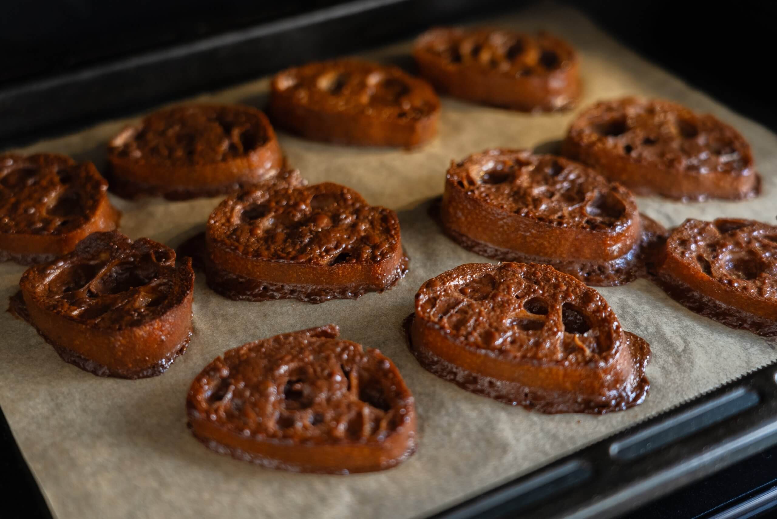 オーブンを160℃に予熱しておく。フランスパンは厚さ1cmに切る。チョコレートは手で細かく折る。