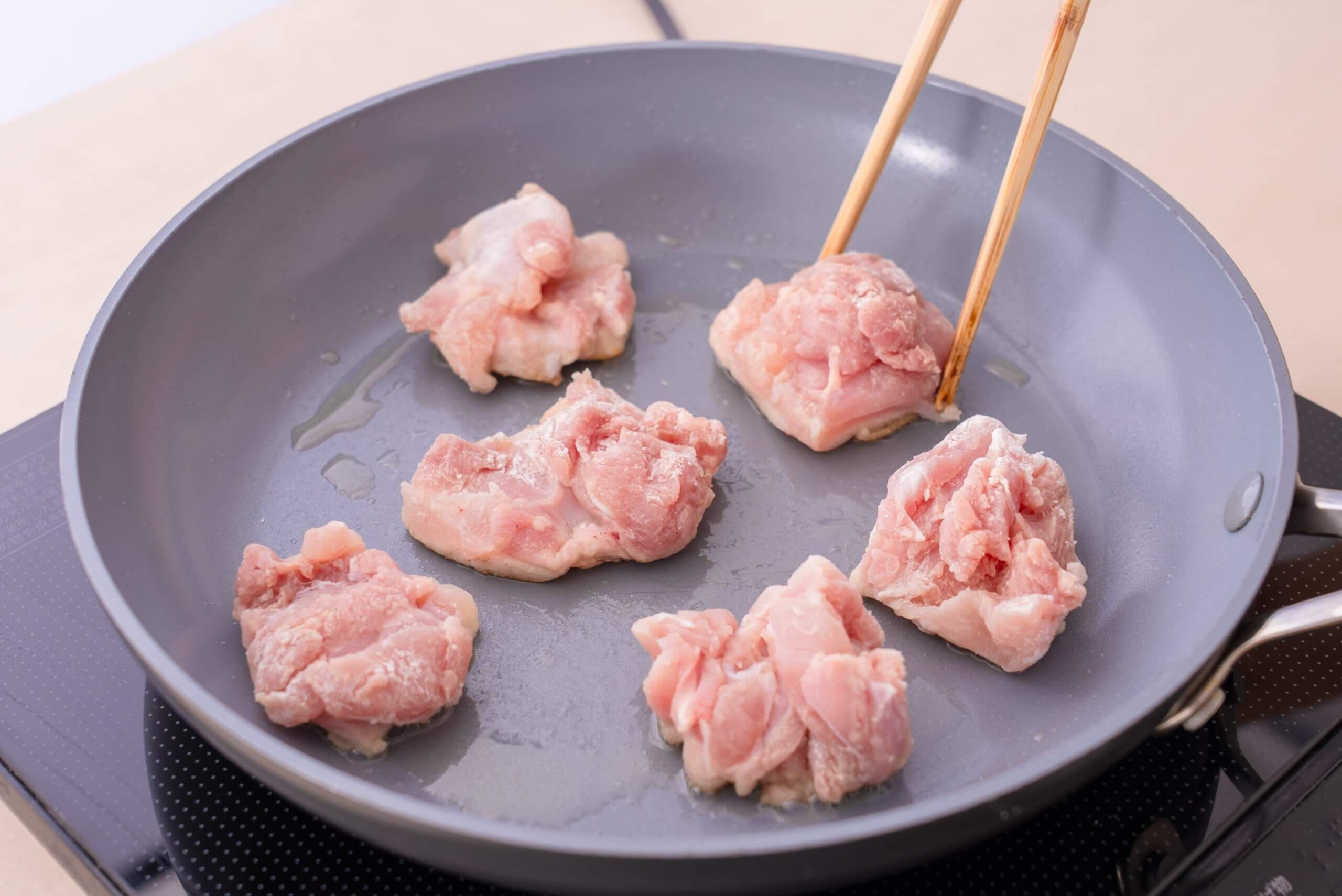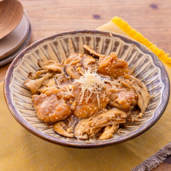 フライパンにごま油を中火で熱し、鶏肉を皮目から並べる。こんがり焼き色がついたら裏返し、弱めの中火で3〜4分焼く。きのこを加えてさっと炒め、油が回ったら全体を軽く広げる。