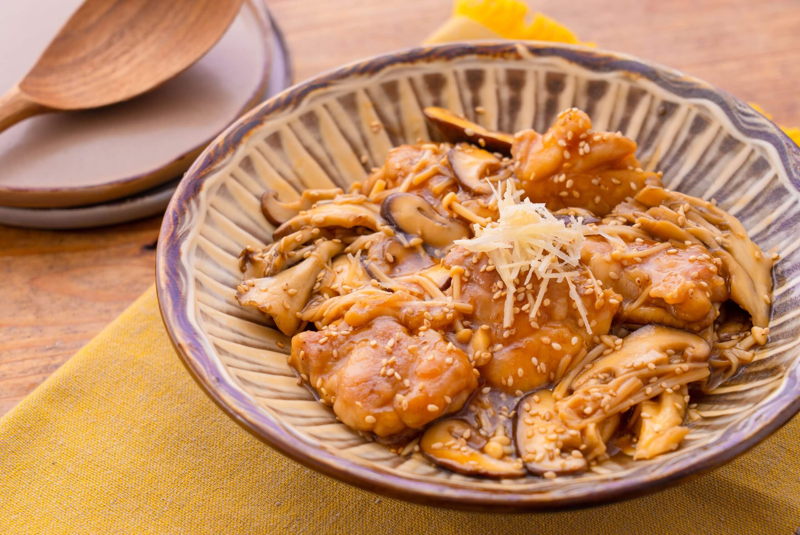 鶏肉は大きめの一口大に切り、塩・こしょうをふって片栗粉をまぶす。きのこは食べやすく切る。しょうがは極細千切りにする。ボウルで【A】をしっかり混ぜておく(片栗粉を溶かす)。