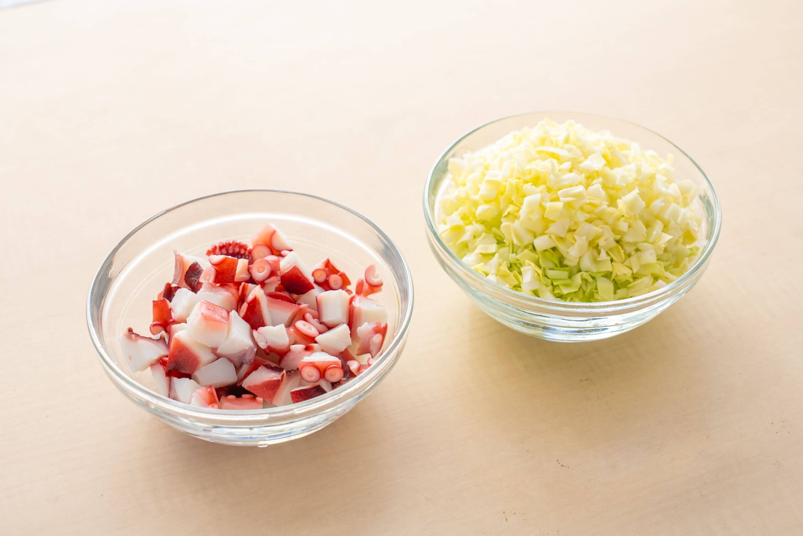 たこは1cm角に切る。キャベツは粗めのみじん切りにする。青ねぎは小口切りにする。