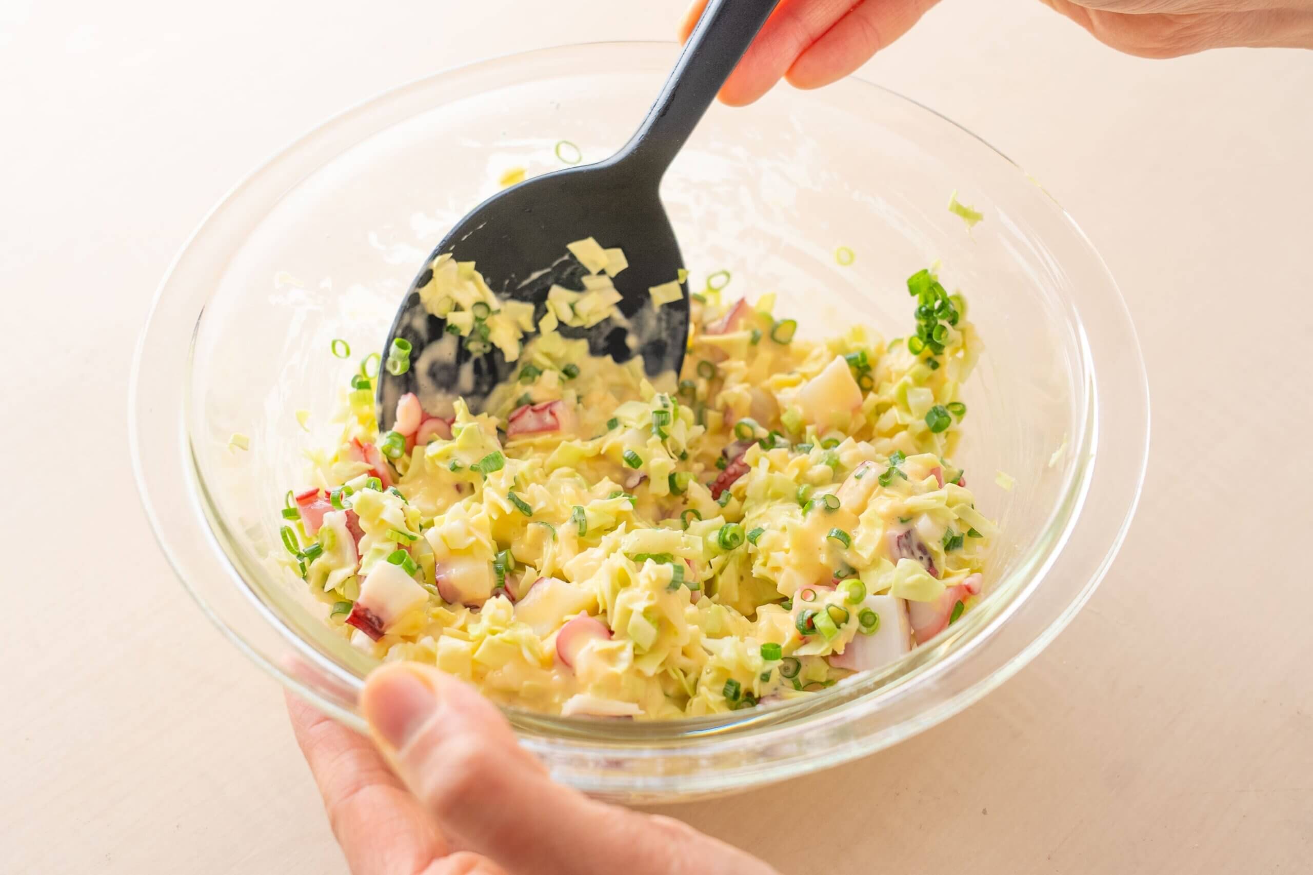 ボウルに卵、水、顆粒和風だしを入れて混ぜ、薄力粉を加えてさっと混ぜる。キャベツ、たこ、青ねぎを加え、ざっと混ぜる。