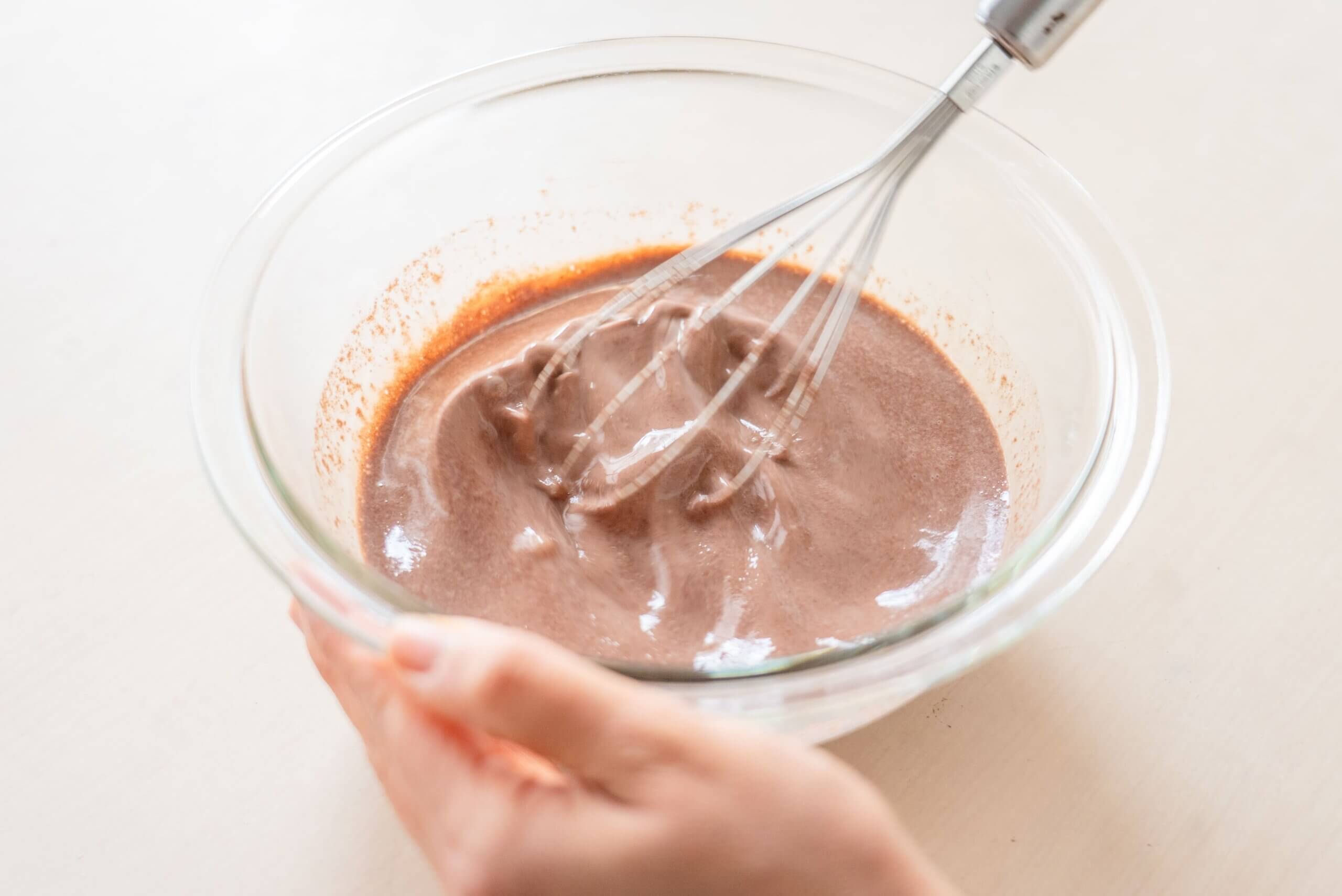 ココアは牛乳(大さじ1)で溶く。ボウルに卵を割りほぐし、残りの牛乳、砂糖、溶いたココアを加えてよく混ぜる。