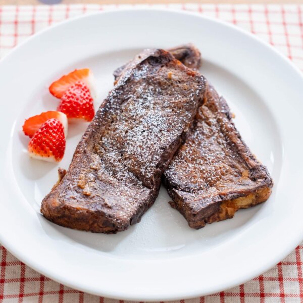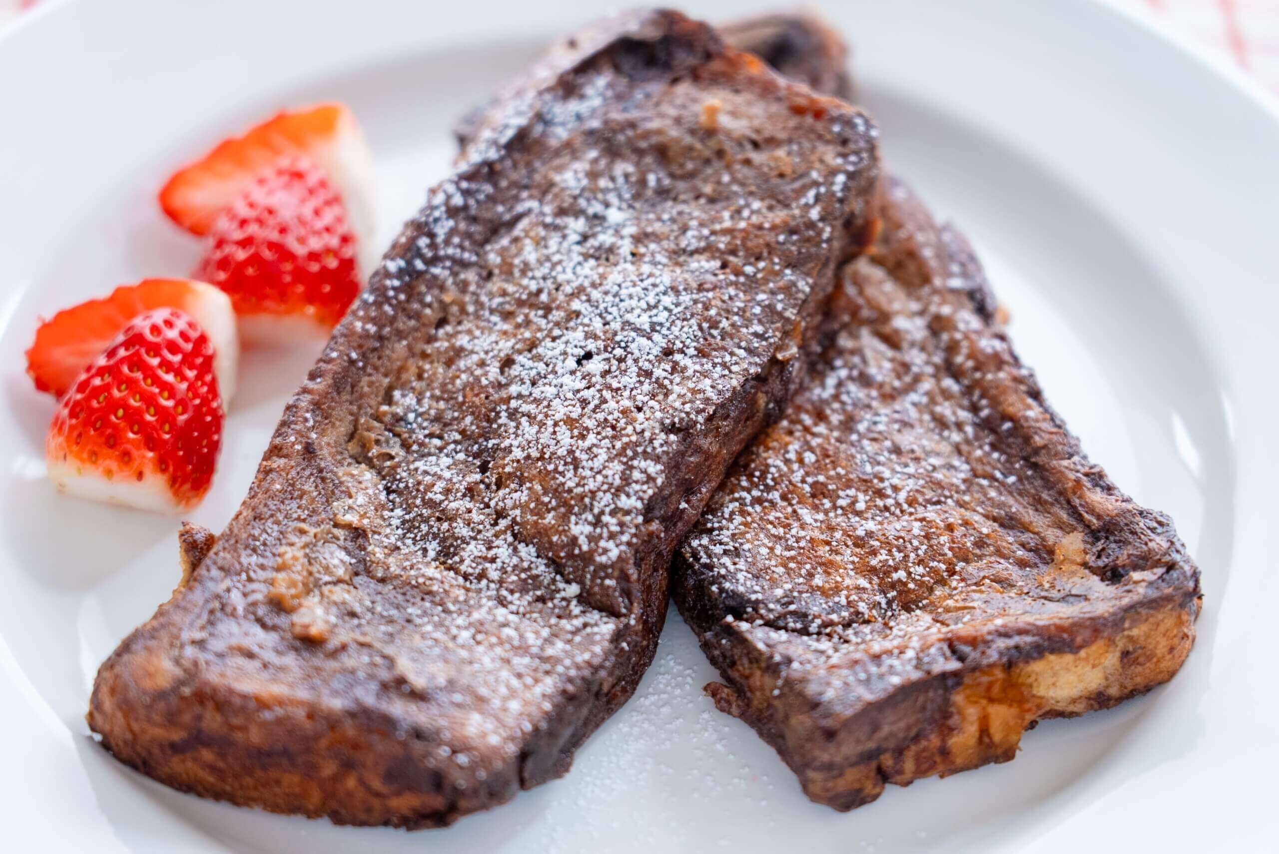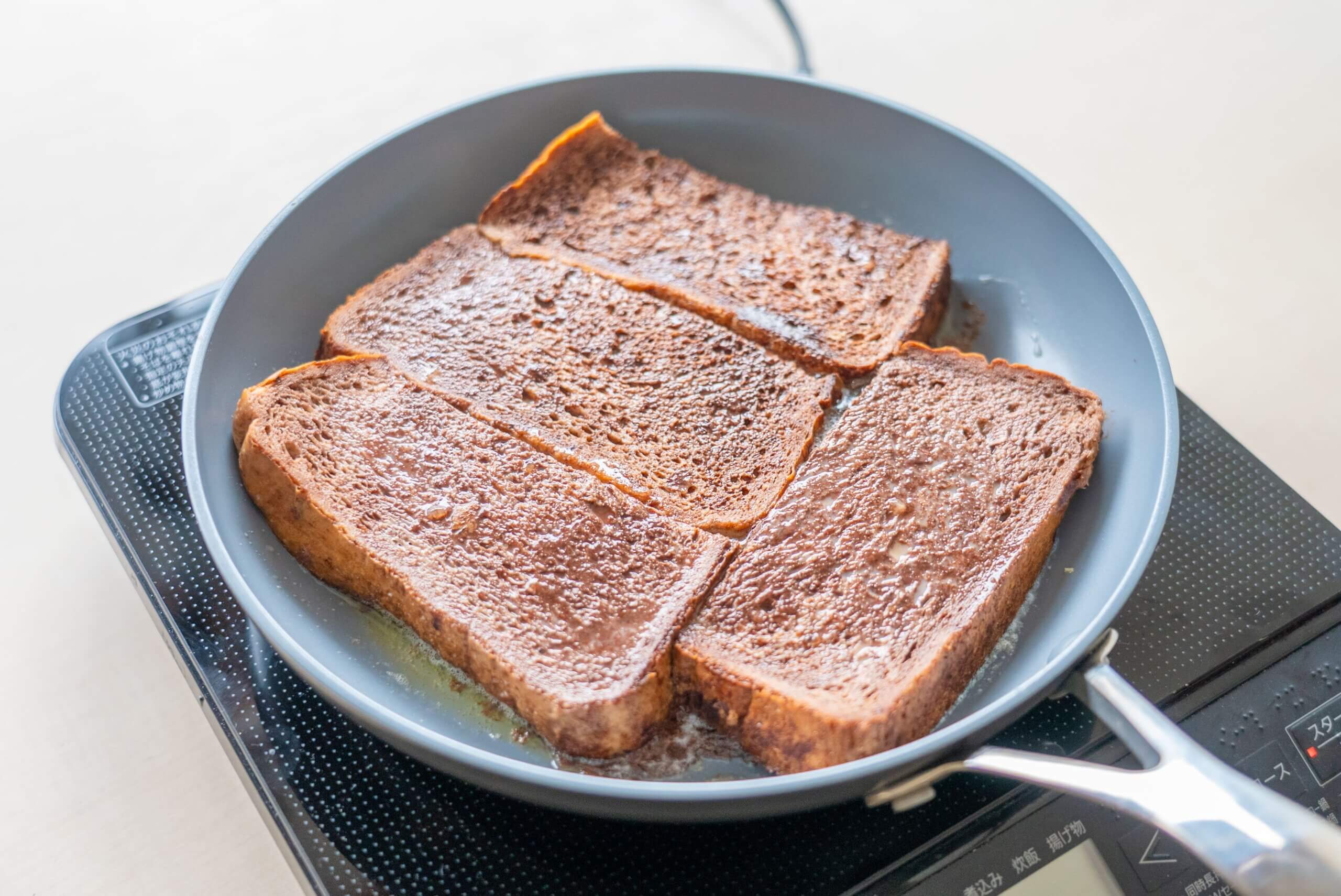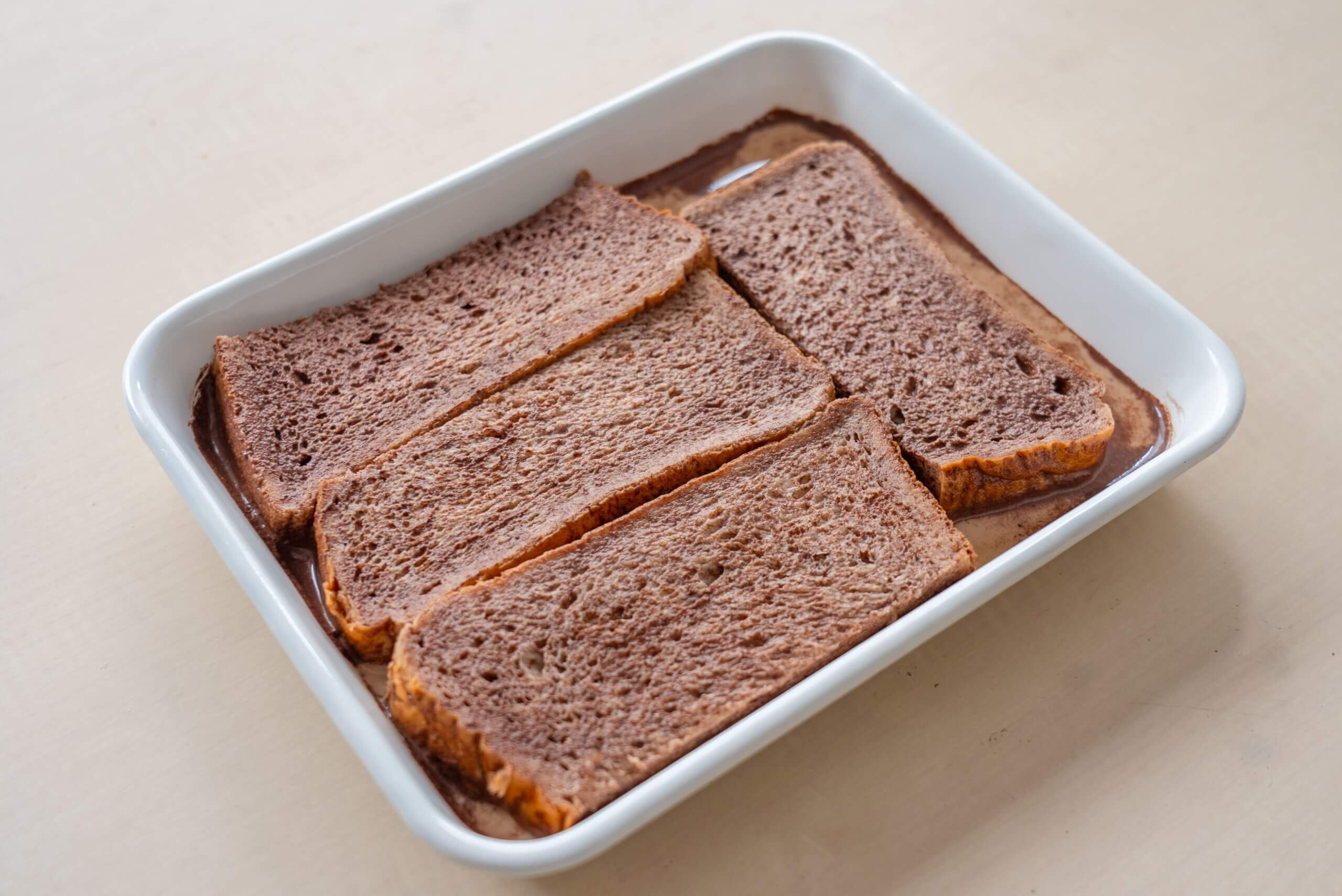 ココアを加えた卵液にパンをじっくり漬け込んで、